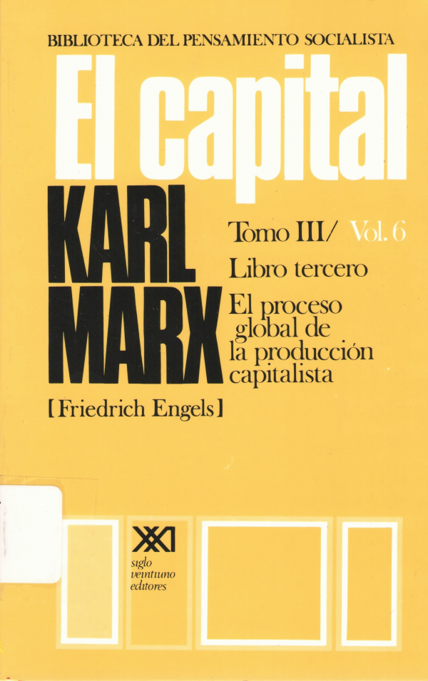 Contenido : Libro primero v.1, v.2 y v.3. El proceso de producción del capital -- Libro segundo v.4. y v.5. El proceso de circulación del capital -- Libro tercero v.6., v.7. y v.8. El proceso global de la producción capitalista